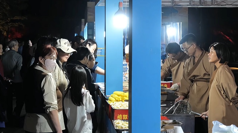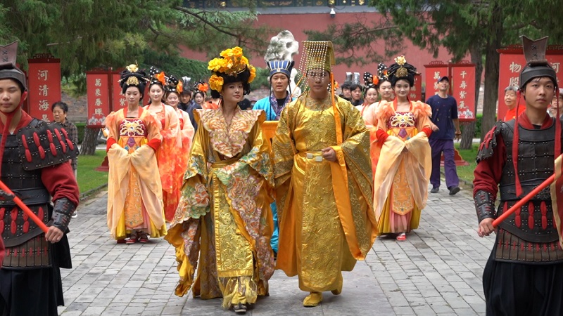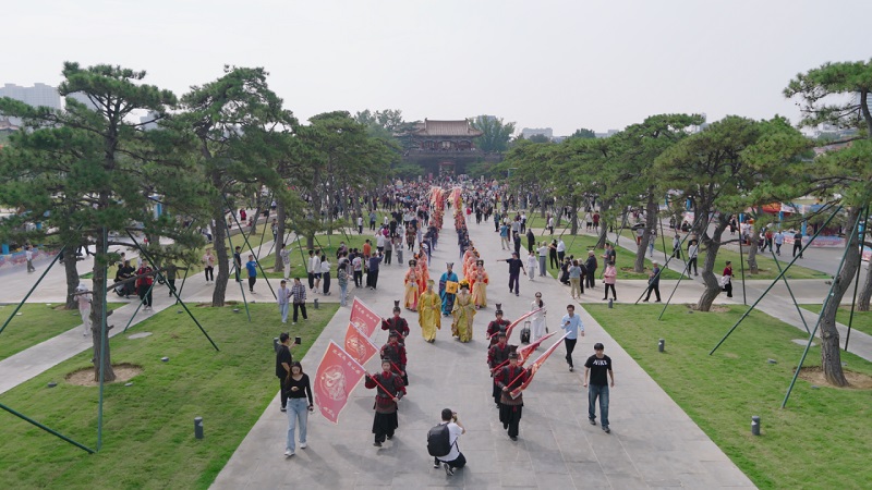 本次文化旅游節(jié)活動(dòng)自10月1日持續(xù)至10月5日,活動(dòng)期間設(shè)置了主題鮮明、層次豐富的特色內(nèi)容。每日10時(shí),來自中華泰山·封禪大典的演藝團(tuán)隊(duì)以《萬國來朝·盛世啟市》主題演出拉開序幕。天鼓初鳴之際,悠遠(yuǎn)號(hào)角與鏗鏘鼓點(diǎn)交織共鳴,依次呈現(xiàn)開場迎賓禮、司禮官肅穆登場、舞姬書生伴唐宮人物(李治、武則天)盛裝巡游。巡游結(jié)束后,演員們將化身隱藏NPC,身著唐宮華服扮演“帝王”“貴妃”等角色,與游客展開對詩猜謎、合影互動(dòng)等環(huán)節(jié)